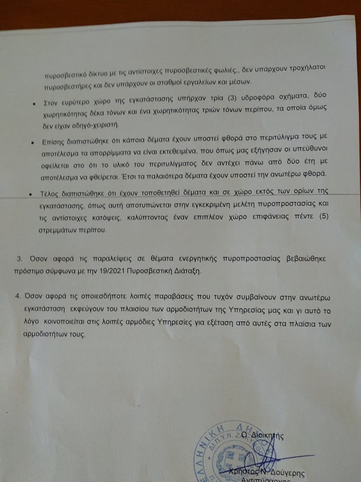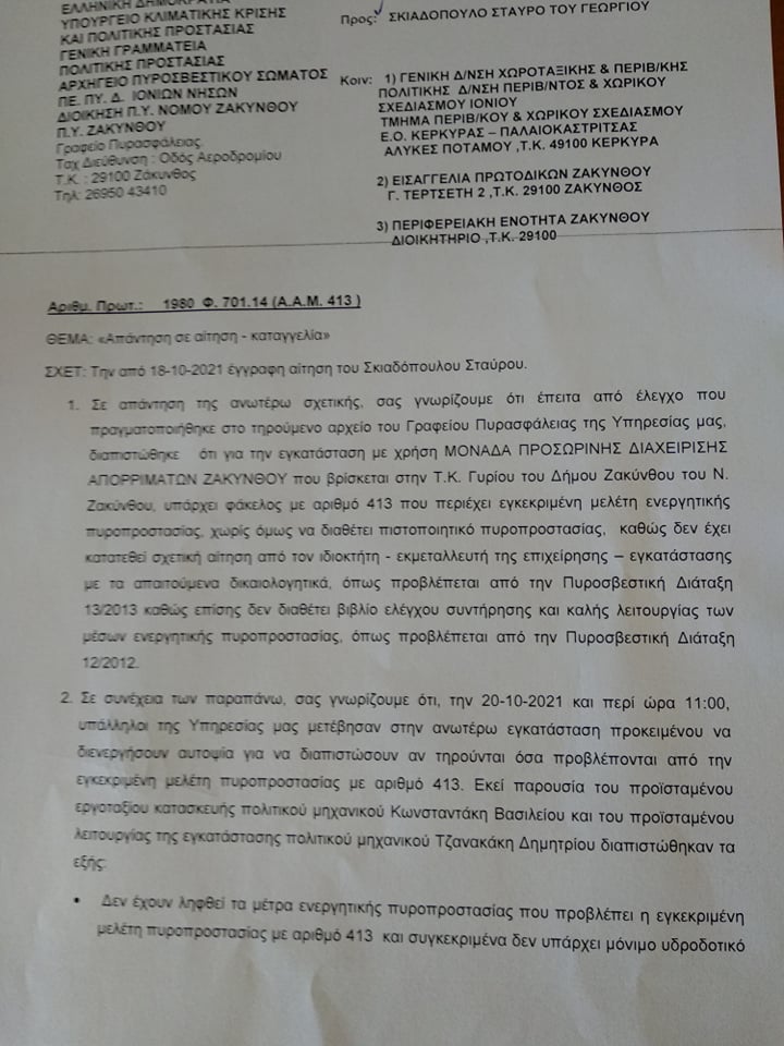 ΑΠΑΝΤΗΣΗ ΣΤΗΝ ΕΓΓΡΑΦΗ ΑΙΤΗΣΗ ΤΟΥ ΠΡΟΕΔΡΟΥ ΤΟΥ ΒΡΑΧΙΩΝΑ , ΣΤΑΥΡΟΥ ΣΚΙΑΔΟΠΟΥΛΟΥ, ΕΚΠΡΟΣΩΠΟΝΤΑΣ ΚΑΙ ΤΙΣ ΑΛΛΕΣ ΠΕΡΙΒΑΛΛΟΝΤΙΚΕΣ ΟΡΓΑΝΩΣΕΙΣ, ΕΔΩΣΕ Η ΠΥΡΟΣΒΕΣΤΙΚΗ ΥΠΗΡΕΣΙΑ,ΠΡΟΧΩΡΩΝΤΑΣ ΣΕ ΕΝΔΙΑΦΕΡΟΥΣΕΣ ΔΙΑΠΙΣΤΩΣΕΙΣ ΚΑΙ ΕΠΙΣΗΜΑΝΣΕΙΣ ΣΧΕΤΙΚΑ ΜΕ ΤΗΝ ΠΥΡΑΣΦΑΛΕΙΑ ΣΤΙΣ ΕΓΚΑΤΑΣΤΑΣΕΙΣ ΤΗΣ ΜΟΝΑΔΑΣ ΠΡΟΣΩΡΙΝΗΣ ΔΙΑΧΕΙΡΙΣΗΣ ΑΠΟΡΡΙΜΜΑΤΩΝ ΖΑΚΥΝΘΟΥ, ΚΑΙ ΟΧΙ ΜΟΝΟ…ΜΕΤΑΞΥ ΑΛΛΩΝ, ΔΙΑΠΙΣΤΩΘΗΚΑΝ ΤΑ ΕΞΗΣ:- ΔΕΝ ΕΧΟΥΝ ΛΗΦΘΕΙ ΤΑ ΜΕΤΡΑ ΕΝΕΡΓΗΤΙΚΗΣ ΠΥΡΟΠΡΟΣΤΑΣΙΑΣ, ΣΥΜΦΩΝΑ ΜΕ ΤΗΝ ΕΓΚΕΚΡΙΜΕΝΗ ΜΕΛΕΤΗ, ΚΑΙ ΣΥΓΚΕΚΡΙΜΕΝΑ ΔΕΝ ΥΠΑΡΧΕΙ ΜΟΝΙΜΟ ΥΔΡΟΔΟΤΙΚΟ ΠΥΡΟΣΒΕΣΤΙΚΟ ΔΙΚΤΥΟ. ΟΠΩΣ ΑΝΑΦΕΡΟΥΝ ΧΑΡΑΚΤΗΡΙΣΤΙΚΑ, «ΣΤΟΝ ΕΥΡΥΤΕΡΟ ΧΩΡΟ ΤΗΣ ΕΓΚΑΤΑΣΤΑΣΗΣ ΥΠΗΡΧΑΝ 3 ΥΔΡΟΦΟΡΑ ΟΧΗΜΑΤΑ, ΧΩΡΙΣ ΟΔΗΓΟ-ΧΕΙΡΙΣΤΗ».- ΙΔΙΑΙΤΕΡΟ ΕΝΔΙΑΦΕΡΟΝ ΕΙΧΕ Η ΔΙΑΠΙΣΤΩΣΗ, ΟΤΙ ΔΕΜΑΤΑ ΕΧΟΥΝ ΥΠΟΣΤΕΙ ΦΘΟΡΑ, ΣΤΟ ΠΕΡΙΤΥΛΙΓΜΑ ΤΟΥΣ, ΜΕ ΑΠΟΤΕΛΕΣΜΑ ΤΑ ΑΠΟΡΡΙΜΜΑΤΑ, ΝΑ ΕΙΝΑΙ ΕΚΤΕΘΕΙΜΕΝΑ ΚΑΙ ΟΠΩΣ ΑΝΑΦΕΡΟΥΝ, ΑΥΤΟ ΟΦΕΙΛΕΤΑΙ ΣΤΟ ΓΕΓΟΝΟΣ, ΟΤΙ ΤΟ ΥΛΙΚΟ ΤΟΥ ΠΕΡΙΤΥΛΙΓΜΑΤΟΣ ΔΕΝ ΑΝΤΕΧΕΙ ΠΑΡΑΠΑΝΩ ΑΠΟ 2 ΕΤΗ.- ΑΚΟΜΗ ΜΕΓΑΛΥΤΕΡΟ ΕΝΔΙΑΦΕΡΟΝ ΕΧΕΙ Η ΔΙΑΠΙΣΤΩΣΗ, ΟΤΙ ΕΧΟΥΝ ΤΟΠΟΘΕΤΗΘΕΙ ΔΕΜΑΤΑ, ΣΕ ΧΩΡΟ ΕΚΤΟΣ ΤΩΝ ΟΡΙΩΝ ΤΗΣ ΕΓΚΑΤΑΣΤΑΣΗΣ, ΚΑΛΥΠΤΟΝΤΑΣ ΕΠΙΦΑΝΕΙΑ 5 ΣΤΡΕΜΜΑΤΩΝ.ΟΛΟΚΛΗΡΩΝΟΝΤΑΣ ΤΙΣ ΔΙΑΠΙΣΤΩΣΕΙΣ ΚΑΙ ΤΙΣ ΕΠΙΣΗΜΑΝΣΕΙΣ ΤΗΣ Η ΠΥΡΟΣΒΕΣΤΙΚΗ ΥΠΗΡΕΣΙΑ, ΚΑΤΑΛΗΓΕΙ «ΟΣΟ ΑΦΟΡΑ ΤΙΣ ΟΠΙΟΙΕΣΔΗΠΟΤΕ ΛΟΙΠΕΣ ΠΑΡΑΒΑΣΕΙΣ, ΠΟΥ ΤΥΧΟΝ ΣΥΜΒΑΙΝΟΥΝ ΣΤΗΝ ΑΝΩΤΕΡΩ ΕΓΚΑΤΑΣΤΑΣΗ, ΕΚΦΕΥΓΟΥΝ ΤΟΥ ΠΛΑΙΣΙΟΥ ΤΩΝ ΑΡΜΟΔΙΟΤΗΤΩΝ ΤΗΣ ΥΠΗΡΕΣΙΑΣ ΜΑΣ, ΚΑΙ ΓΙ ΑΥΤΟ ΤΟ ΛΟΓΟ, ΚΟΙΝΟΠΟΙΕΙΤΑΙ ΣΤΙΣ ΛΟΙΠΕΣ ΑΡΜΟΔΙΕΣ ΥΠΗΡΕΣΙΕΣ,ΓΙΑ ΕΞΕΤΑΣΗ…».