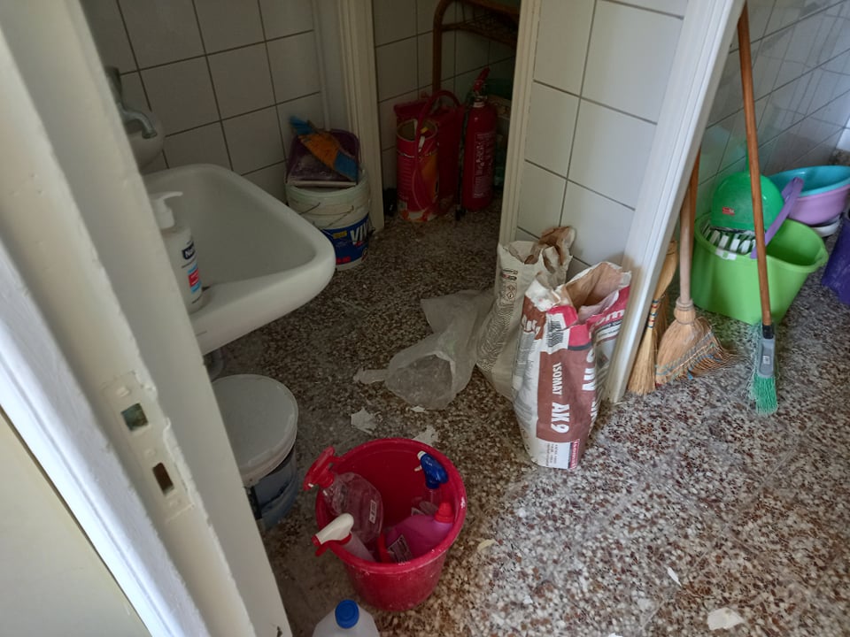 - Να χύνονται τα νερά από τις τουαλέτες έξω και να πηγαίνουν σήμερα να κάνουν εργασίες; Είναι σπασμένα πλακάκια, δεν έχουν καθαριστεί οι εσωτερικές τουαλέτες. Έχουν βάλει τον πυροσβεστήρα στο δάπεδο και αν περάσει παιδάκι θα χτυπήσει.