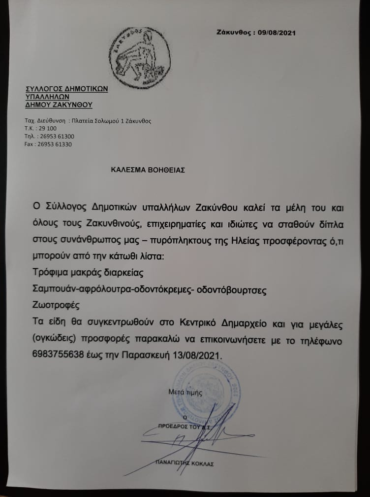O ΣΥΛΛΟΓΟΣ ΕΡΓΑΖΟΜΕΝΩΝ ΤΟΥ ΔΗΜΟΥ ΖΑΚΥΝΘΟΥ , ΑΝΑΛΑΜΒΑΝΕΙ ΠΡΩΤΟΒΟΥΛΙΑ ΓΙΑ ΤΗ ΣΥΓΚΕΝΤΡΩΣΗ ΑΝΘΡΩΠΙΣΤΙΚΗΣ ΒΟΗΘΕΙΑΣ, ΠΡΟΣ ΤΟΥΣ ΠΥΡΟΠΑΘΕΙΣ ΤΗΣ ΠΕΛΟΠΟΝΗΣΣΟΥ, ΣΥΓΚΕΝΤΡΩΝΟΝΤΑΣ ΑΓΑΘΑ ΠΡΩΤΗΣ ΑΝΑΓΚΗΣ, ΟΠΩΣ ΤΡΟΦΙΜΑ ΜΑΚΡΑΣ ΔΙΑΡΚΕΙΑΣ, ΣΑΜΠΟΥΑΝ, ΑΦΡΟΛΟΥΤΡΑ, ΟΔΟΝΤΟΚΡΕΜΕΣ, ΟΔΟΝΤΟΒΟΥΡΤΣΕΣ ΚΑΙ ΖΩΟΤΡΟΦΕΣ.