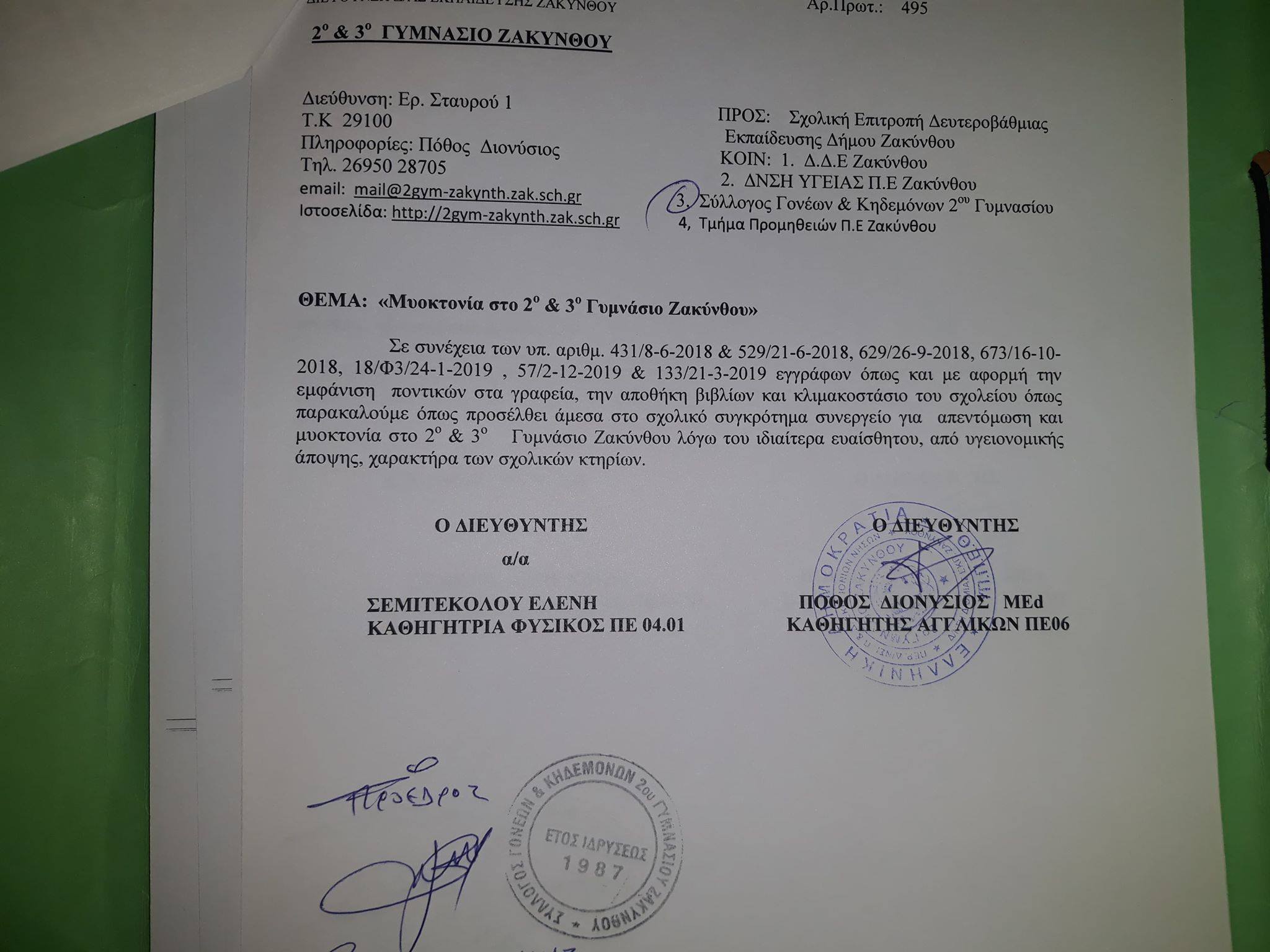 Ο ΝΙΚΟΣ ΒΑΡΔΑΚΑΣΤΑΝΗΣ με ΕΓΓΡΑΦΑ ΑΠΑΝΤΑ στον ΝΙΚΗΤΑ ΣΠΙΝΟ για την εμφάνιση τρωκτικών στο 2ο και 3ο Γυμνάσιο Ζακύνθου
