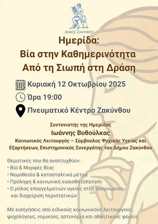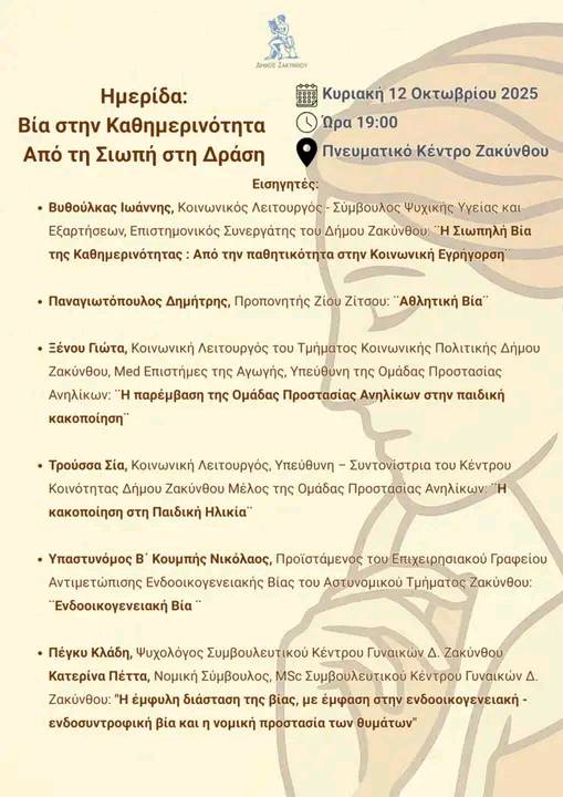 Ημερίδα ανοιχτή στο κοινό με τίτλο «Βία στην καθημερινότητα – Από τη σιωπή στη δράση». Η εκδήλωση θα πραγματοποιηθεί την Κυριακή 12 Οκτωβρίου 2025, στις 19:00, στο Πνευματικό Κέντρο Ζακύνθου,